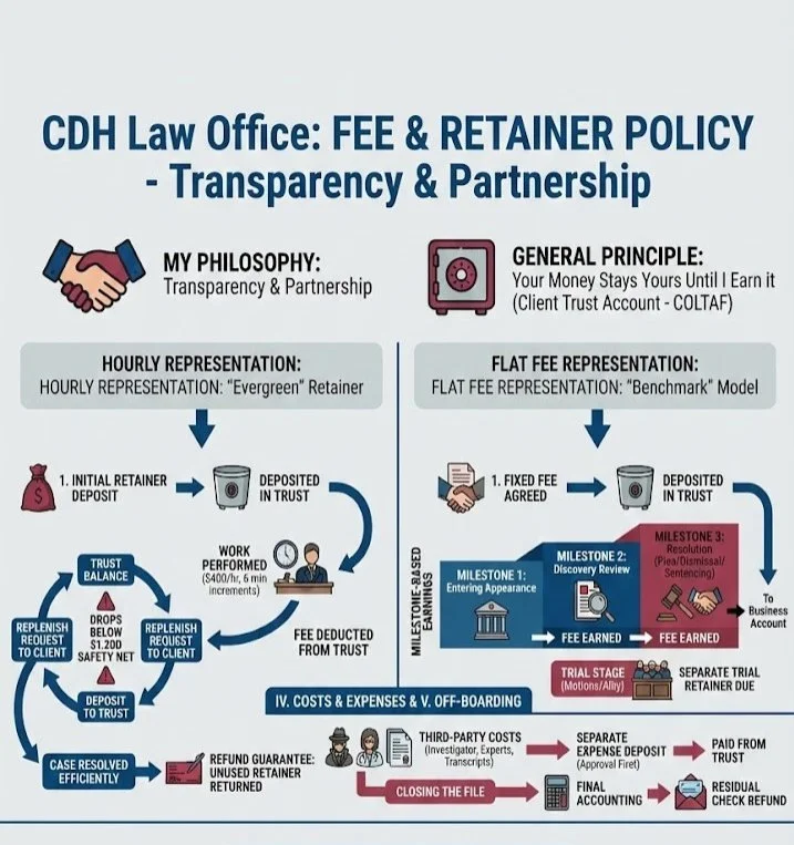 You deserve to understand exactly how your money is handled. This policy summarizes how retainers and fees work at CDH Law Office, in plain English.